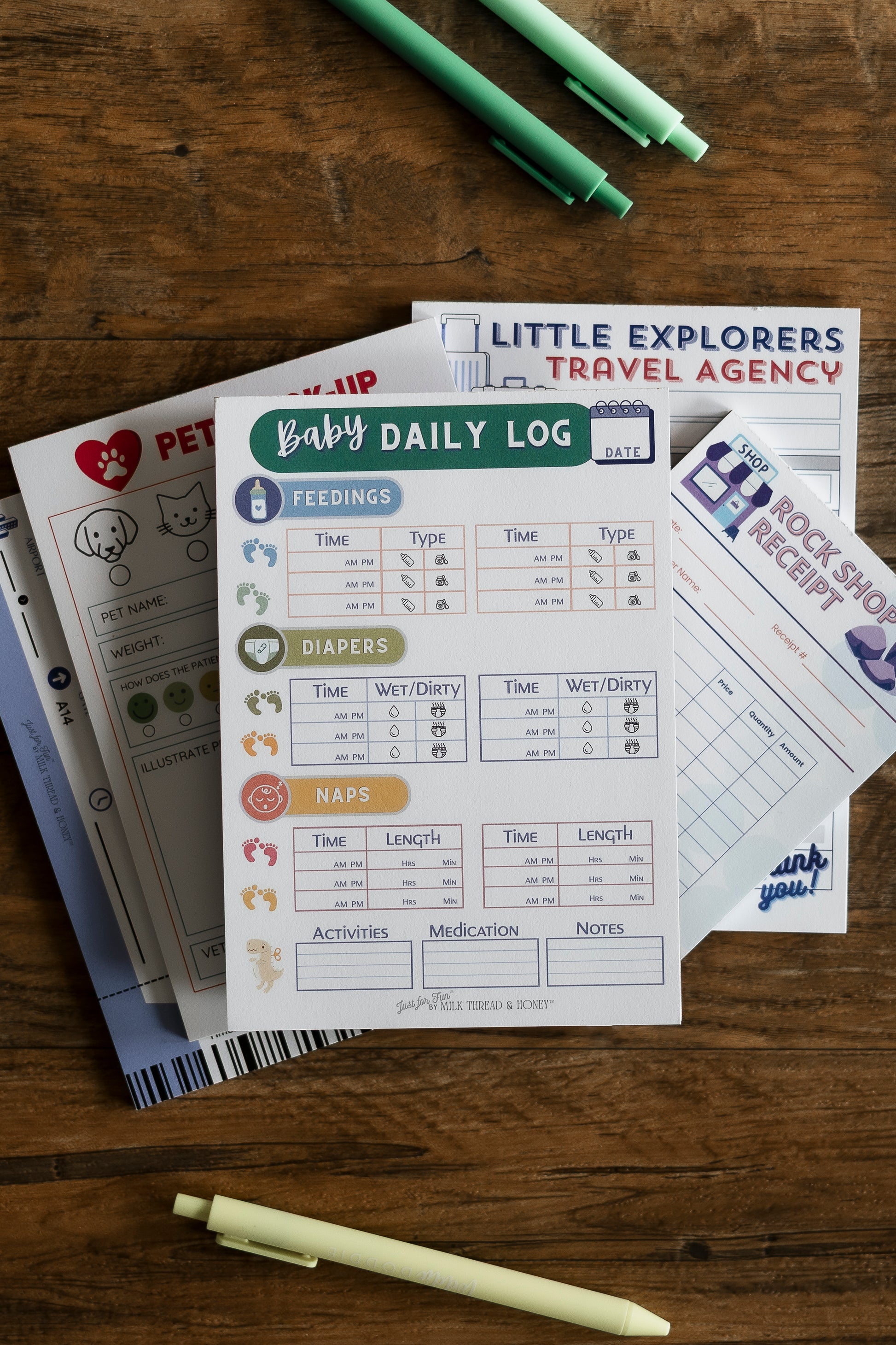Pretend play baby doll daycare log notepads inspire pretend creative play and spark your child’s imagination for hours of screen-free playtime! It’s a fun and interactive way for kids to step into the role of caregiver. These unique notepads encourage creativity, problem-solving, and imaginative play. They offer options of pretend doll daycare notepad through bright and engaging graphics to make the experience more realistic and exciting, while teaching kids about the duties of different jobs.