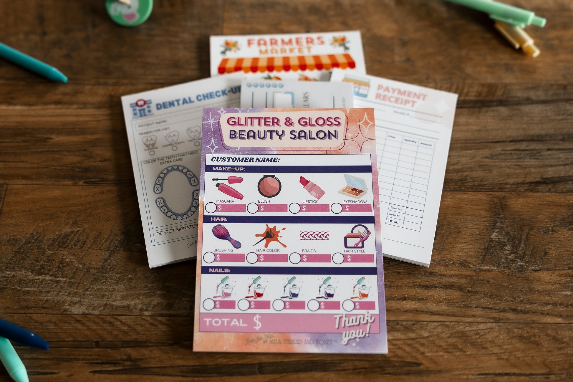 Pretend play beauty salon menu notepads will inspire pretend creative play and spark your child’s imagination for hours of screen-free playtime! It’s a fun and interactive way for kids to step into the role of beauty salon or make-up artist. These unique notepads encourage creativity, problem-solving, and imaginative play. They offer ideas for a pretend beauty parlor through bright and engaging graphics to make the experience more realistic and exciting, while teaching kids about the duties of different jobs.