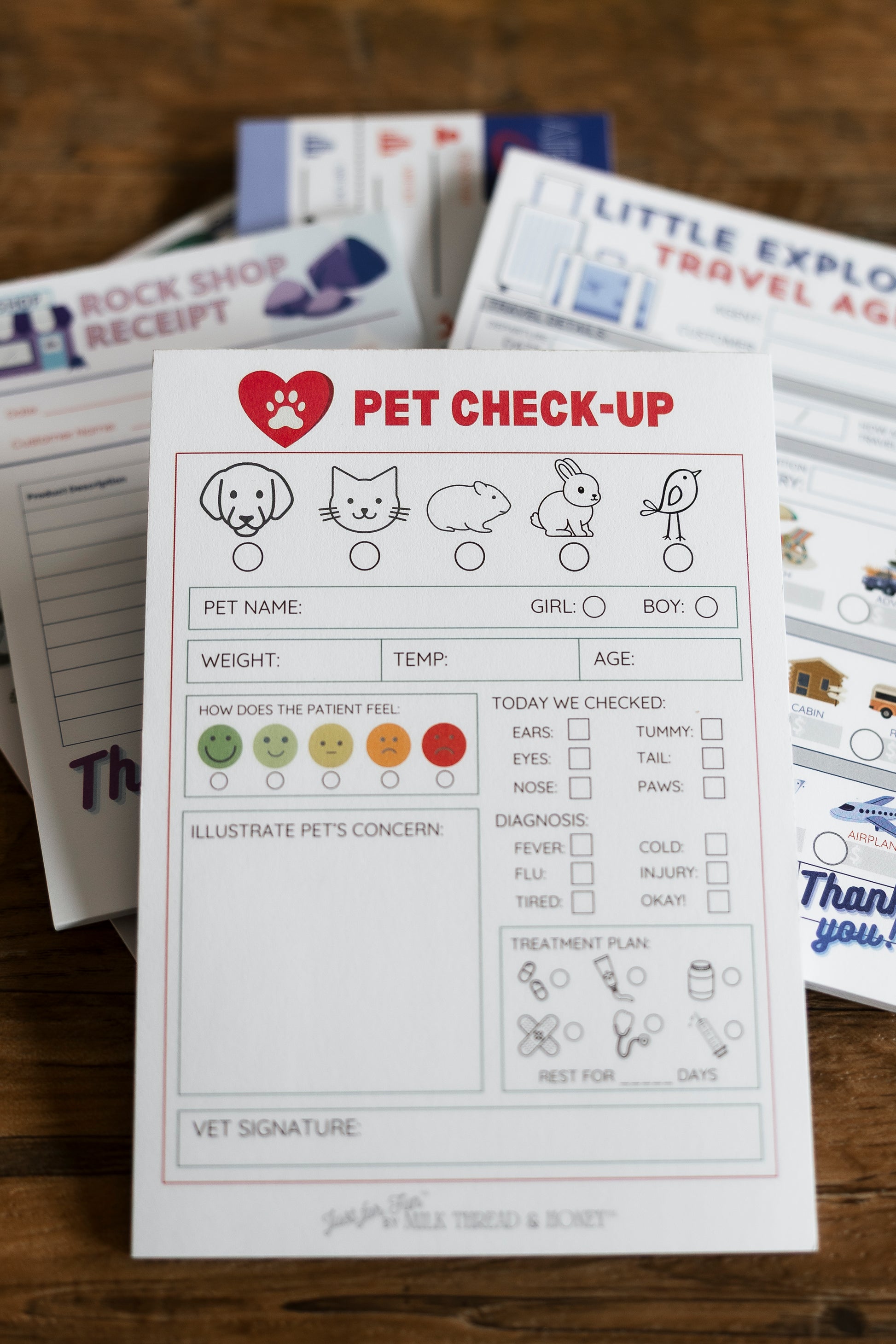 Transform playtime into an imaginative adventure with this set of 5 different pretend play notepads! Each pad contains 25 pages and is specially designed to help children explore various professional roles - including veterinary check-up, travel agent forms, boarding passes, daycare log for dolls and receipts for a rock shop. These realistic-looking forms feature engaging graphics and dedicated spaces for writing, encouraging kids to step into exciting roles while developing creativity and problem-solving skills. Perfect for screen-free entertainment, these notepads measuring between 3.5x7 inches and 5x7 inches provide hours of interactive play. Made in the USA, this set is ideal for playrooms, classrooms, or as a thoughtful gift that combines fun with learning. Whether your child dreams of becoming a travel agent, business owner, veterinarian, and more, these notepads create an immersive play experience that sparks imagination and helps them understand different occupations through hands-on pretend play.